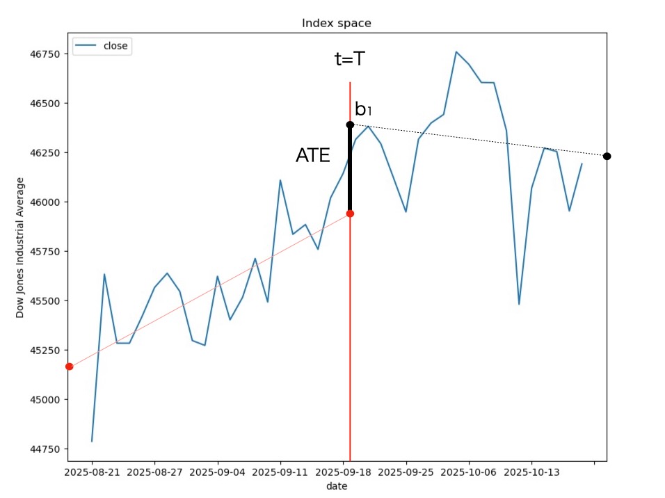 このATEは図18に見られるように、時間t=TにおけるT以前の回帰における終端(t=T)の値と 時間T以後の線形回帰の切片(intercept)の差分です。従ってATEは、